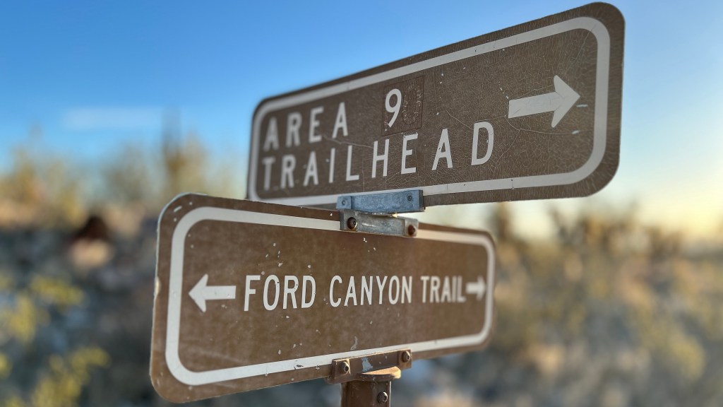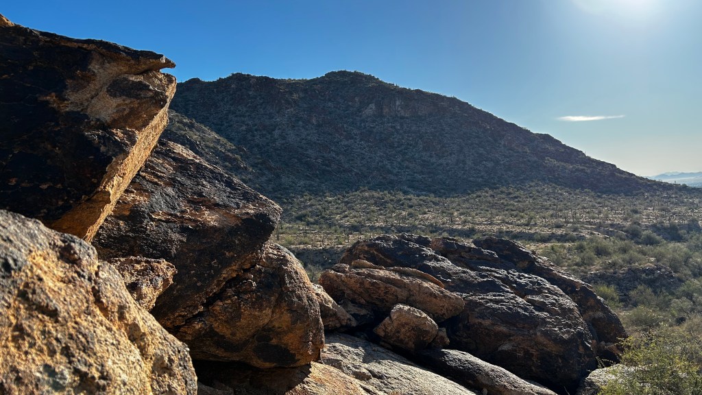 This waypoint takes a delightful turn from the lush Pacific Northwest to a sunny Southwest desert near Surprise, Arizona, the home of my in-laws. During this brief visit, I was thrilled to seize the opportunity for an early morning hike just minutes away in the beautiful White Tank Mountains. The park’s gates opened at 6 a.m., so I eagerly arrived first thing to enjoy the cooler weather and lighter trail traffic. As I waited for the gate to open, I looked behind me and saw the most beautiful sunrise with that iconic deep orange shade familiar in much of the artwork from the area. I found the Ford Canyon trailhead at Area 9 in the park, which was just a few miles away, and followed a section of the trail that spanned 6 miles with an elevation gain of over 800 feet. The early part of the trail offers a pleasant saunter, with the real ascent beginning a couple of miles in, featuring some fun bouldering that leads to the rock formation at the hike’s peak. There are benches along the lower part of the trail, thoughtfully placed for resting at great viewing waypoints. They also serve as heartfelt memorials. I took a pause at each one to acknowledge their loved ones who placed them there (the memorials are listed at the end of this journal entry).