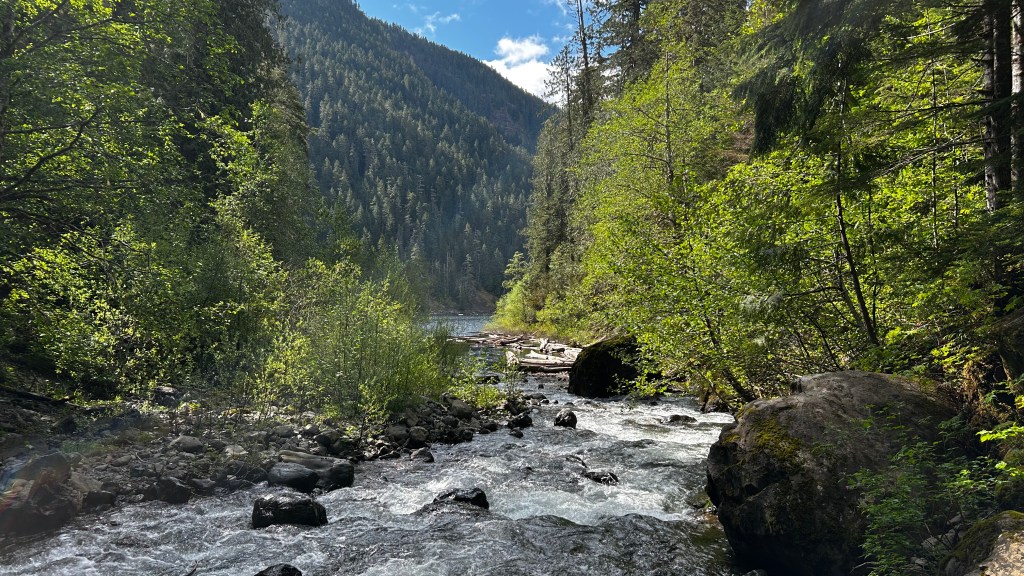As I continued, the Lower Lena Lake Trail eventually ascended to a stunning lookout point, where I perched on a large rock, gazing out over the tranquil waters of Lena Lake nestled in the mountains. It was a peaceful pause, a moment to breathe and appreciate the beauty that surrounded me. I pressed on to the end of the lake, where the river flowed gracefully into its depths. Though this would be the only river I encountered for the day, the sound of rushing water was with me at many turns, a reminder that beauty doesn’t need to be seen to be enjoyed. The descent felt quicker, like the release of a breath held too long, yet I remained cautious, careful not to let my guard down and risk an ankle-twisting stumble. By the time I reached the trailhead, I gave a satisfying exhale, recognizing that my weariness was a sign of a day well spent.