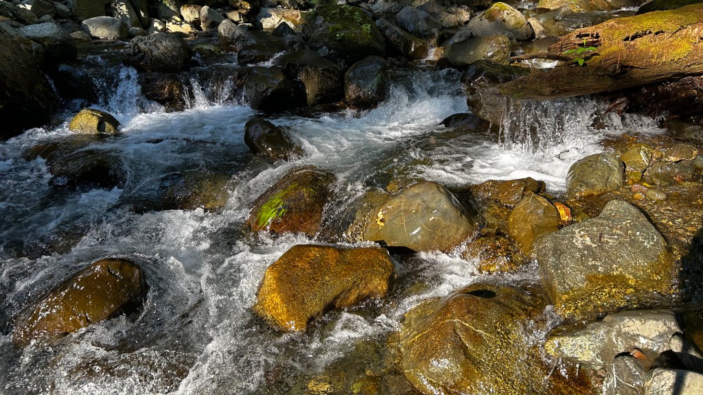 Eventually, the gravel road led me to a trailhead marked with a sign: “Dry Creek Trail.” Leaving the road behind, the trail continued to follow alongside beautiful Lake Cushman, which had a soft shade of green today. It was lovely and serene. So far, nothing too strenuous. Along the way, I even spotted a couple of tree houses! A bit further up the trail, I came across a stunning rock wall, adorned with thick, vibrant, green moss and water trickling down through every nook and cranny. It felt like nature’s little gift, motivating me for what was yet to come. That’s when my trials began: an unforgiving ascent that was as steep as it was long. It felt like it would never end, and every step was a challenge. As I climbed higher, I found the trail was a bit overgrown, and I was grateful for my bug repellent—because it was definitely put to the test! Closer to the top, I needed to navigate through patches of water and deep mud, some of which was impossible to avoid. It was a real slog, and I could feel my expectations building for what lay ahead—a serene creekside retreat that I hoped would make it all worthwhile. The creek was beautiful, an made for a nice resting stop. I took my pack off, sat on a rock and enjoyed a little snack before heading back.