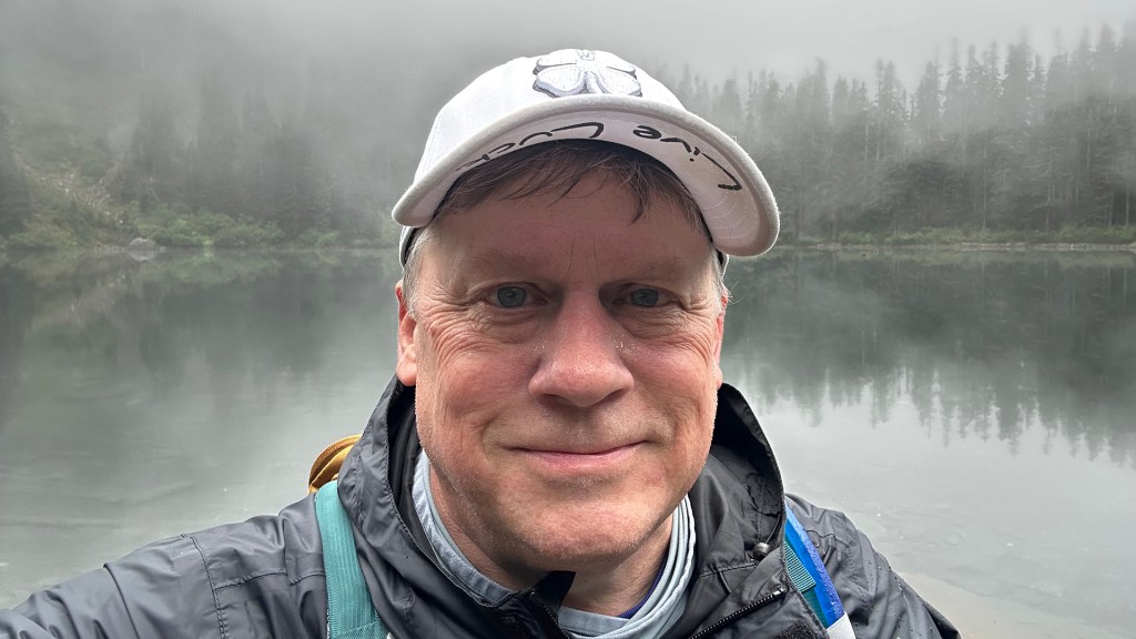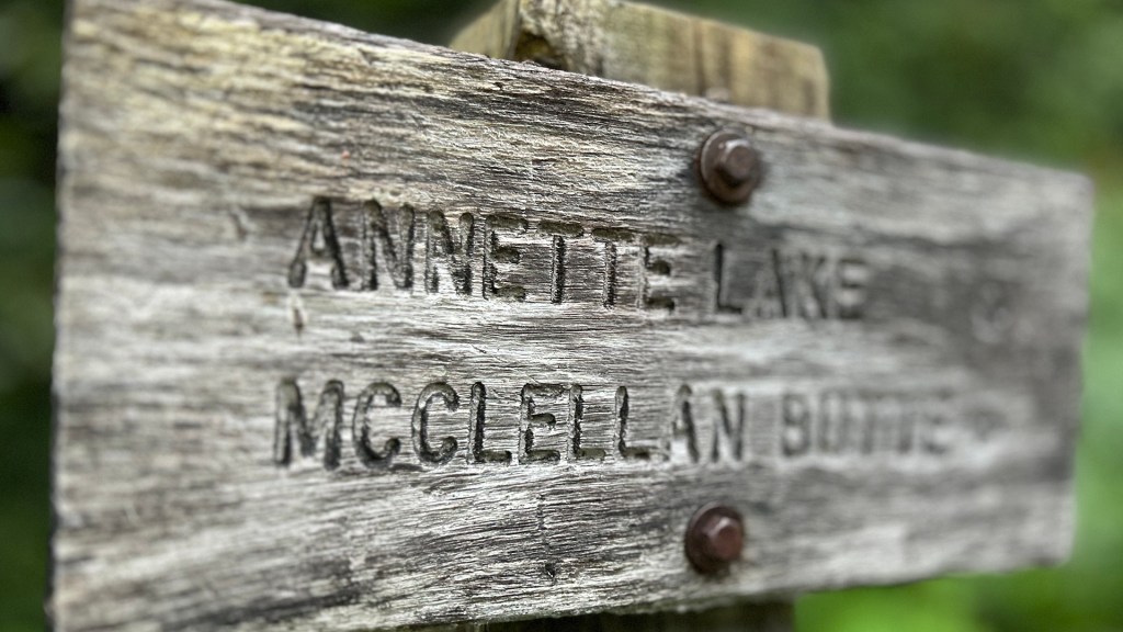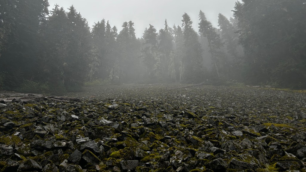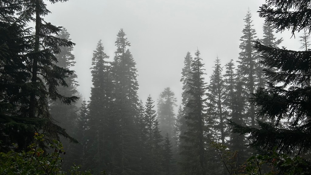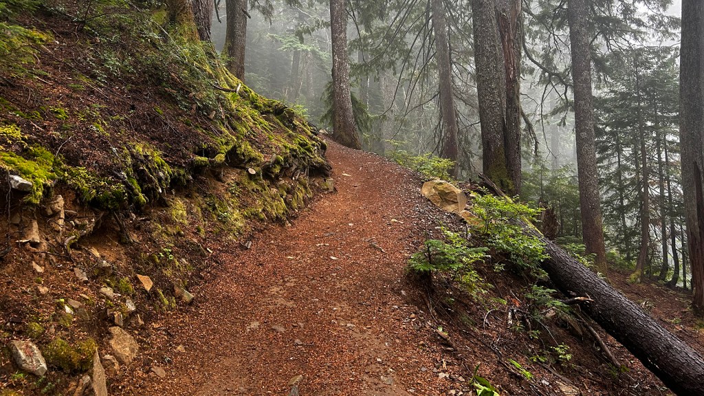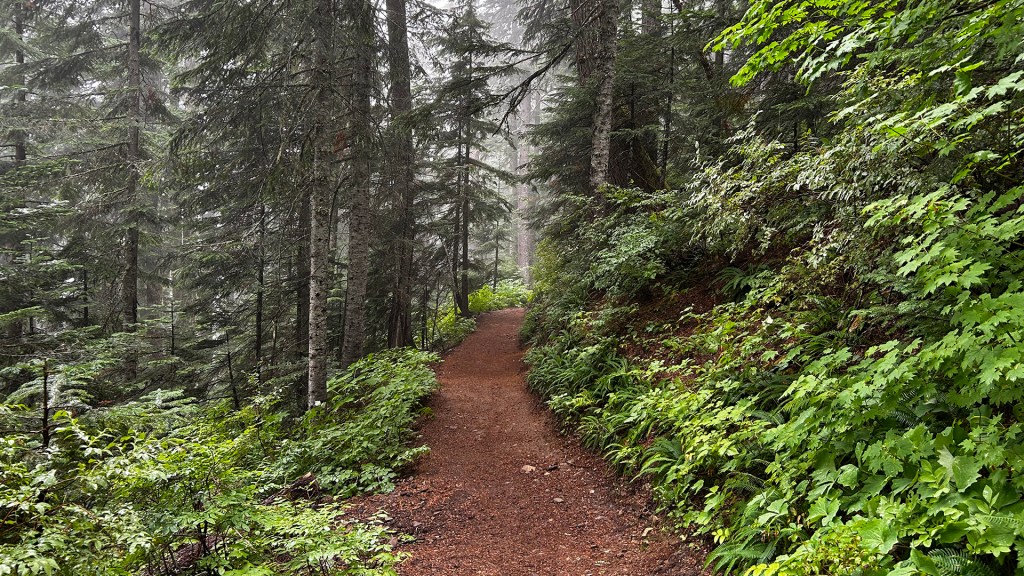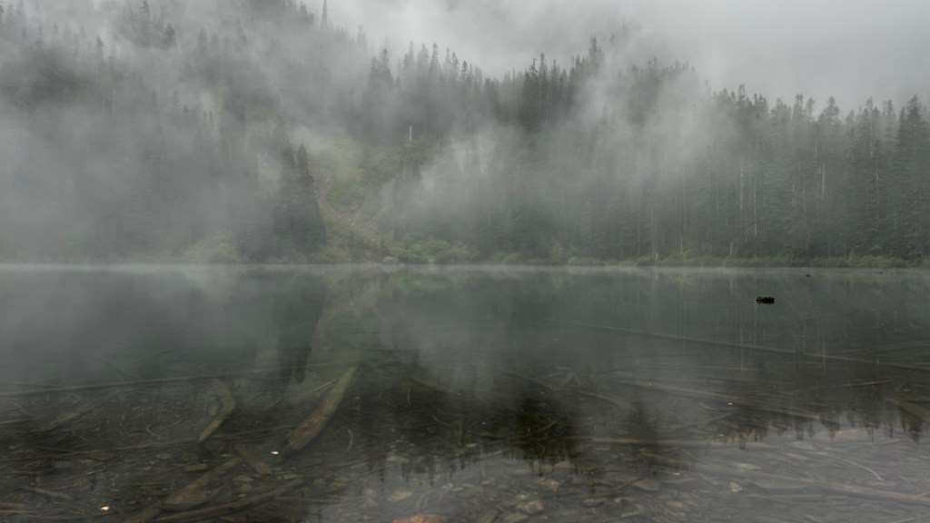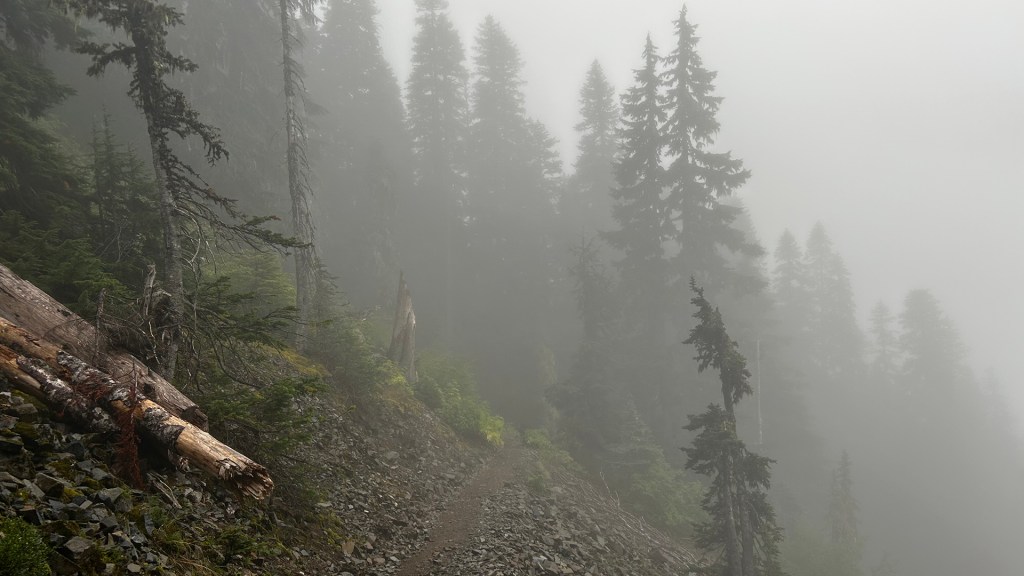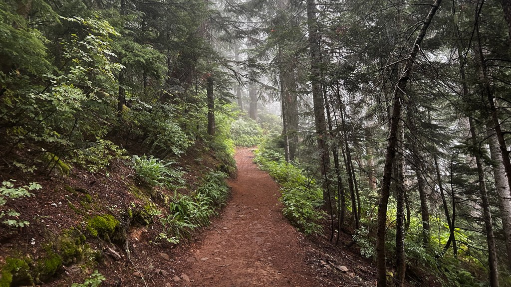 The fog gently blanketed the landscape, obscuring the vast views I know were waiting just beyond the swirling clouds. In moments like this, I remind myself that, much like in life, the most beautiful things often lie just out of sight, allowing us to sense their presence. As I drew closer to Annette Lake, the mist enveloped the water, creating a serene view that invited reflection. The stillness of the lake mirrored my own thoughts, until, with joyful abandon, two dogs leaped into the water, breaking the tranquility with their playful splashes. Their unrestrained joy felt infectious, reminding me that reaching our destination is often sweeter when embraced with a childlike sense of playfulness and wonder. They accompanied me on most of my descent, adding a touch of warmth to the journey.