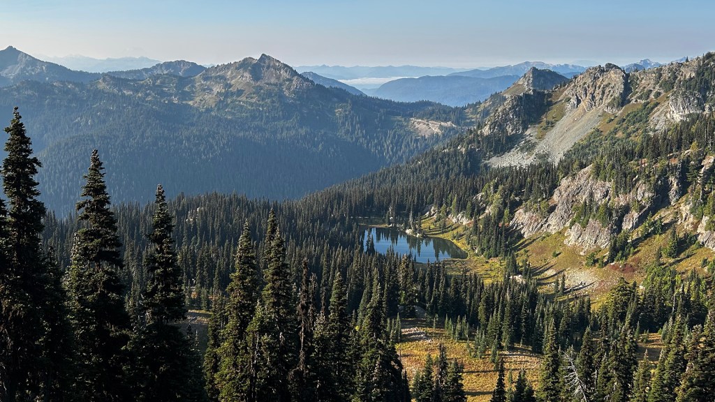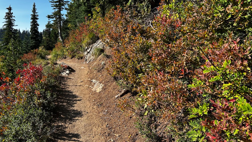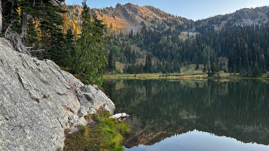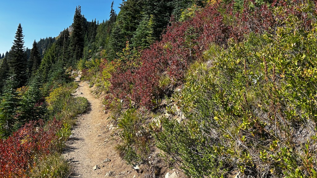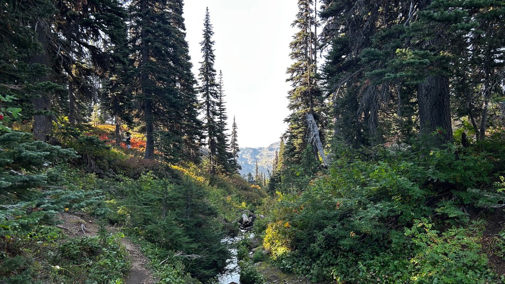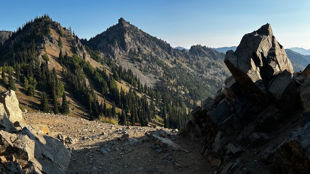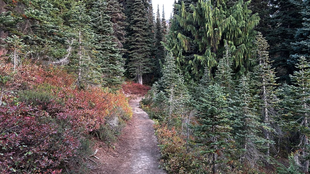 Here, I paused, letting the serenity of the moment wash over me, pondering the delicate balance of life, love, and gratitude that often revisits my thoughts during these hikes. As I continued towards Sourdough Gap, the trail began to incline gently. The vibrant displays of the changing season was a joyous sight with spring and summer retreating, and autumn popping with color against the grays, greens and browns of the landscape. The sun began to rise, illuminating peaks that could feel its warmth. Dust swirled around my feet with each step, a reminder of the earth’s presence beneath me, grounding me as I ascended. The trail was well-maintained, and dust turned to rock, inviting me to keep pushing forward. The last stretch towards Sourdough Gap became steep, but it was manageable, each step a test of determination. As I reached the gap, I was greeted by breathtaking panoramas of the cascades and a view from the lake I had just visited.