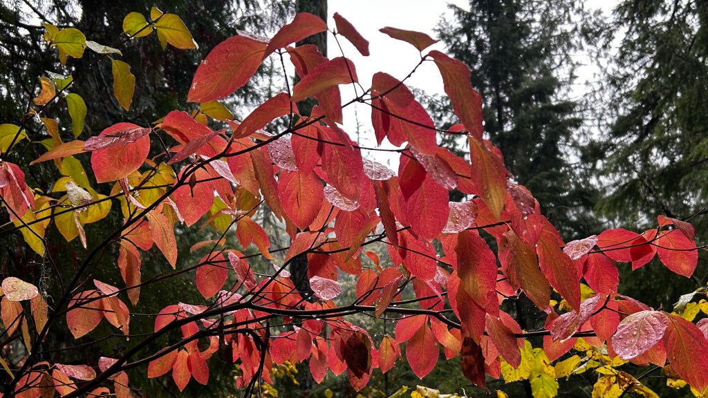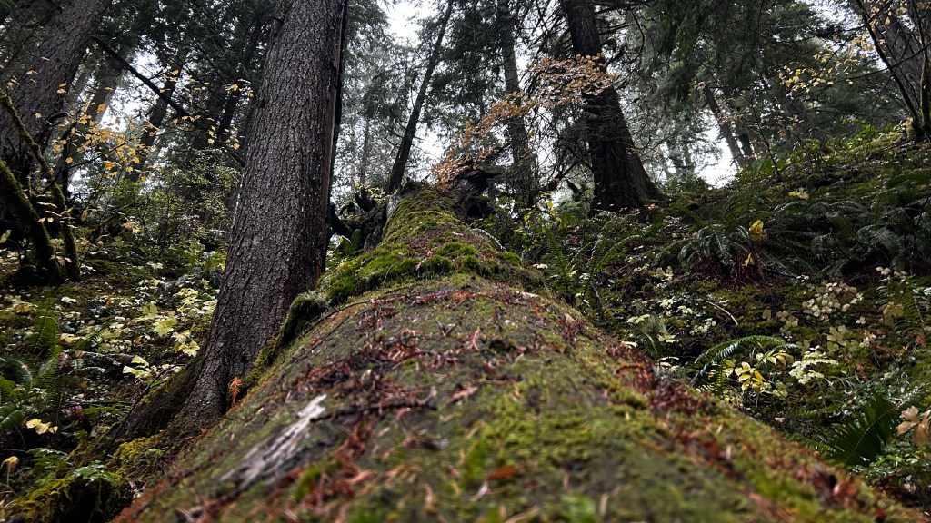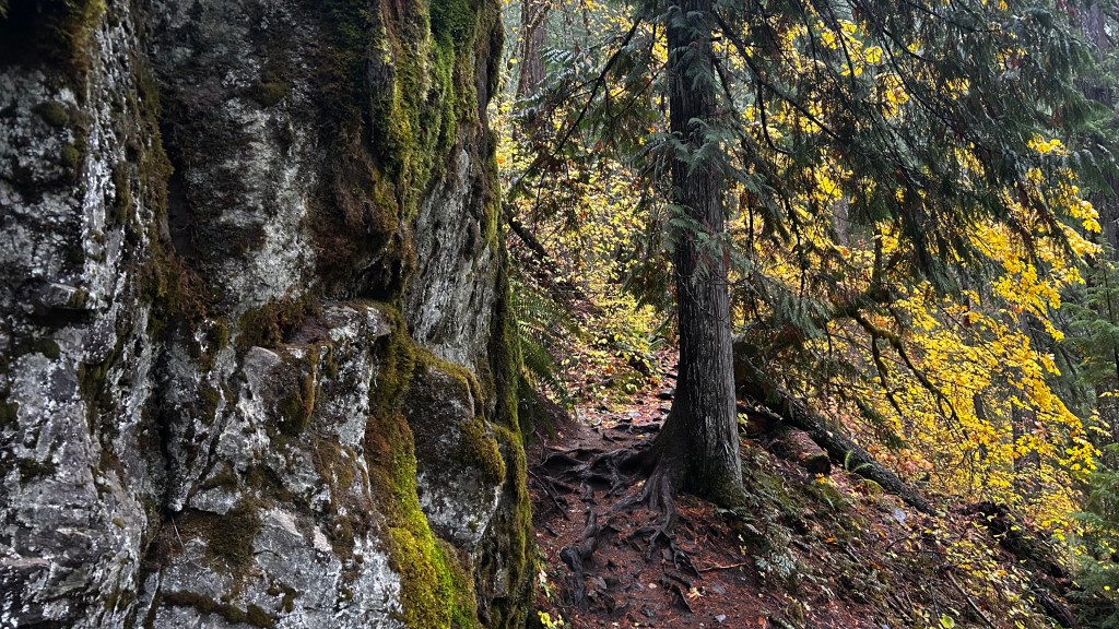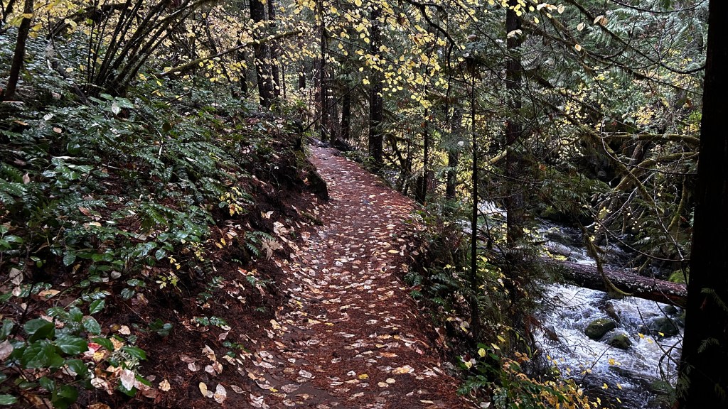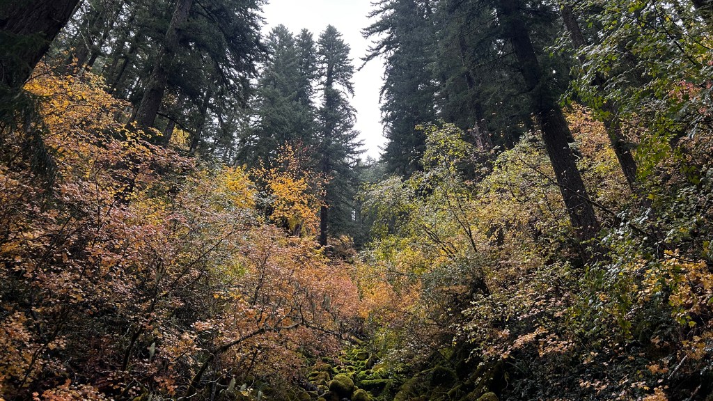 The trail welcomed me with its familiar embrace, though puddles and mud required thoughtful footwork. As I ventured deeper, the rain danced through the towering trees, a soothing symphony of droplets cascading onto leaves, rocks, and the soft earth beneath my feet. The air was thick with the earthy scent of moss and damp wood, an acquired scent of the Pacific Northwest that felt both invigorating and comforting. Each step drew me closer to the sound of rushing water, a melody that drowned out the rain’s delicate notes. I found myself wandering off the main path, drawn to the creek’s edge, where I paused to admire the vibrant fall colors flanking the creek on both sides. It was as if I had stepped into a living painting, each leaf an explosion of reds and golds, singing songs of the season.