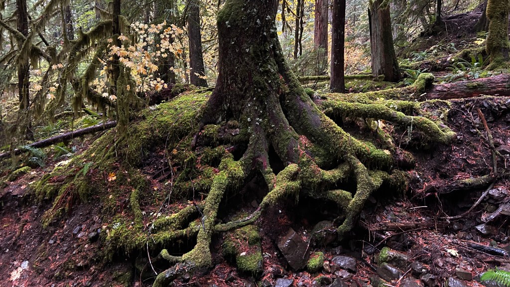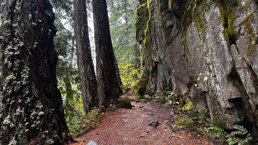 I took a road toward Falls Creek Falls in Gifford Pinchot National Forest, the rain was falling steadily, and had been for days, creating a rhythmic pattern against my windshield, pushed by the wind between swipes of the wipers. Through this mosaic the autumn landscape blurred into a living watercolor painting, each drop enhancing the vibrant hues of the trees. Pulling into a makeshift parking spot just a mile shy of the trailhead—thanks to a fallen tree blocking the road—I felt a rush of anticipation. I stepped over the rugged trunk, the smell of damp earth filling my lungs as I set off down the dirt road, my boots squelching into the mud. The trailhead loomed ahead, marked by a sign warning of closure due to the government shutdown. Yet, with adventure in my heart, I shrugged off the caution. After all, this is about the unexpected twists and turns of the journey, right?