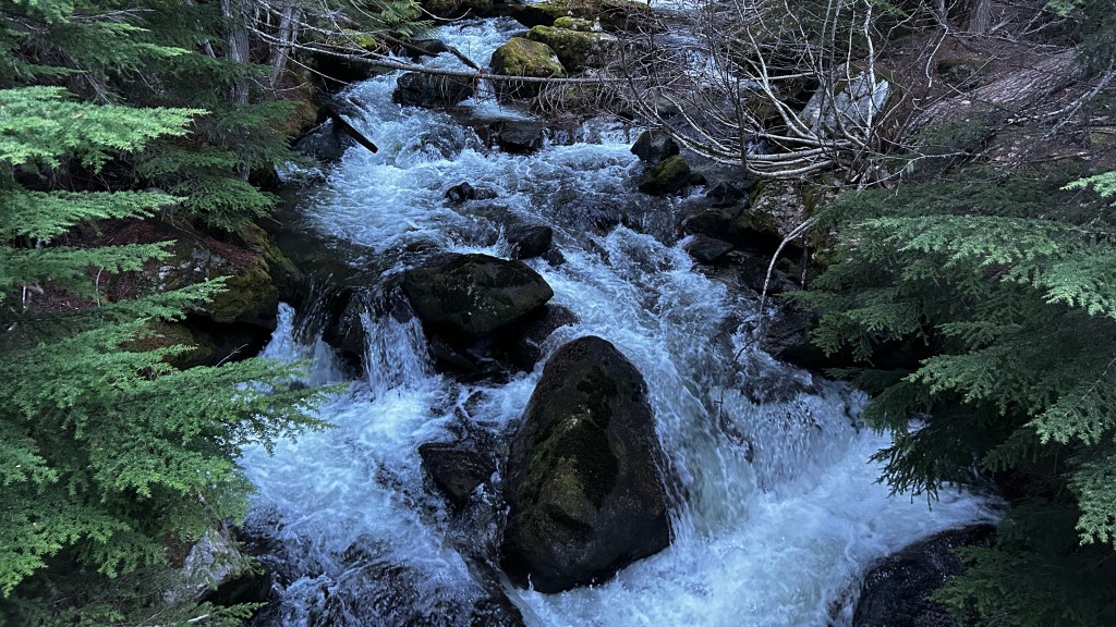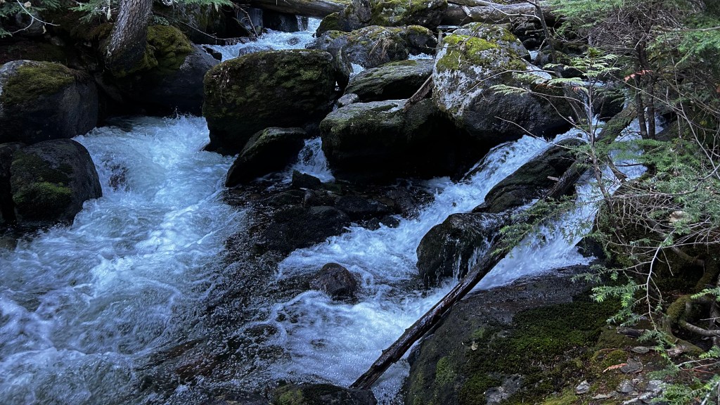 With each footfall, the darkness gradually surrendered to the soft hues of dawn, revealing the rugged trail of dirt, roots, and scattered rocks that wound alongside mountaineer creek. The sound of rushing water filled the air, competing with the howling wind that swept through the trees, creating a vibrant backdrop to my ascent. The invigorating scent of cedar, fresh water, and damp earth filled my lungs, and as I climbed higher, the towering mountains on either side loomed majestically, their silhouettes etched against the brightening sky. The contrast from my last rainforest hike was striking; this landscape, raw and untamed, invigorated my spirit. I paused to shed a layer, feeling the warmth of my exertion mixing with the cool mountain air, and I reminded myself that this journey was about savoring every moment, each step a testament to the beauty of the trail.