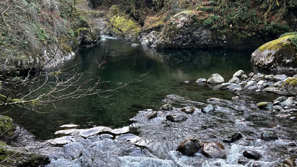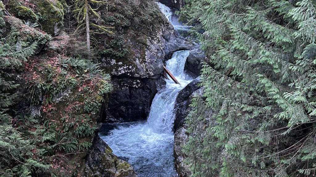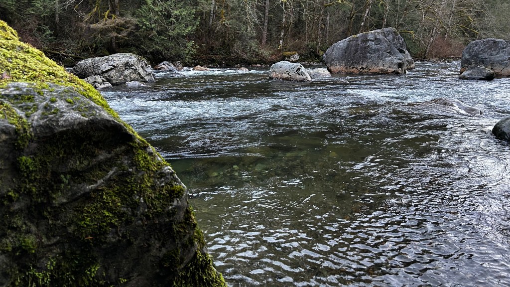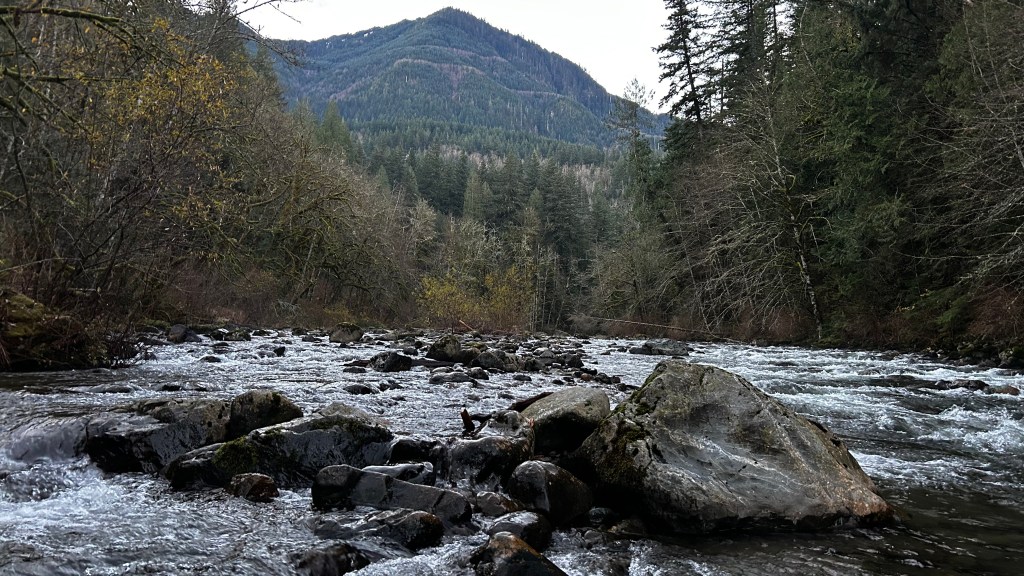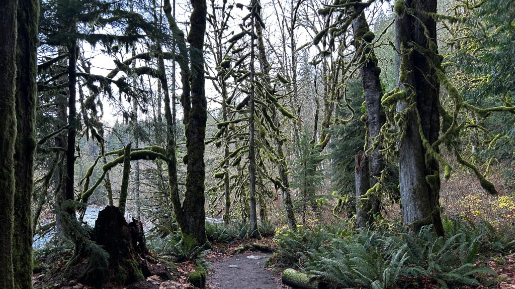 As I ventured along the trail, the sound of the river’s roar filled the air, a symphony of nature harmonizing with my thoughts. The path was well groomed with dirt, roots, and rocks, demanding careful attention to my footing, especially in the slick spots where autumn’s remnants had left a muddy canvas. Here and there, vibrant splashes of fall colors clung to the trees, defiantly resisting the encroaching chill of winter. Each step was a dance of balance and contemplation, surrounded by the iconic elements of the Pacific Northwest—towering trees draped in emerald moss, patches of mushrooms peeking through the damp earth, and the ever-present rush of the river, a reminder of the power of nature’s flow.