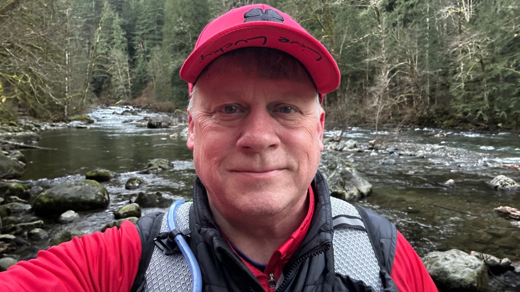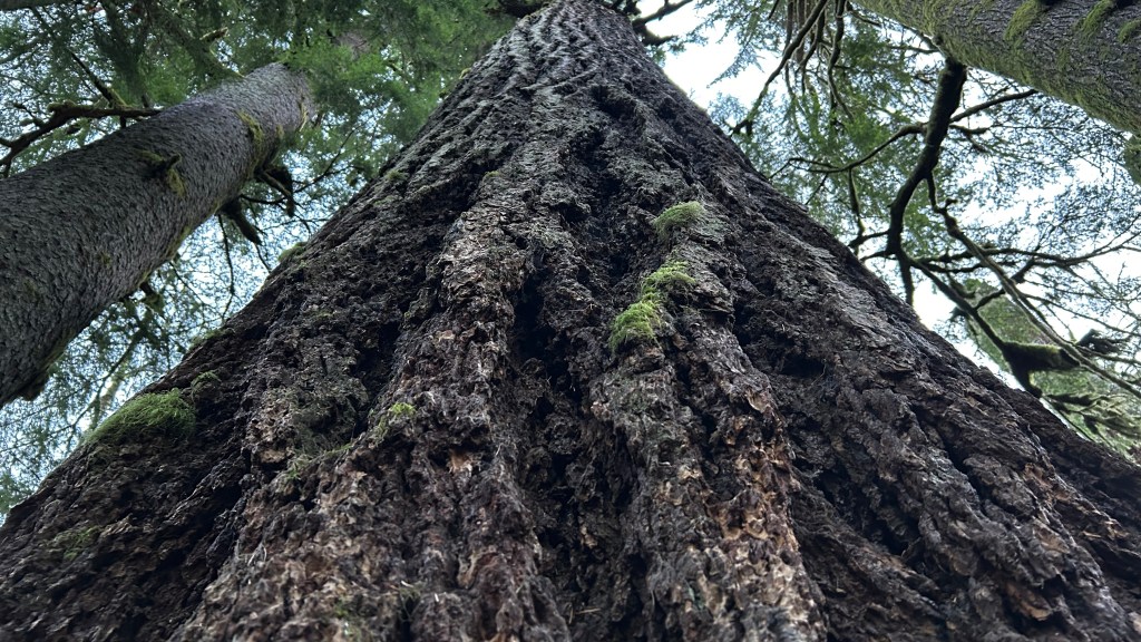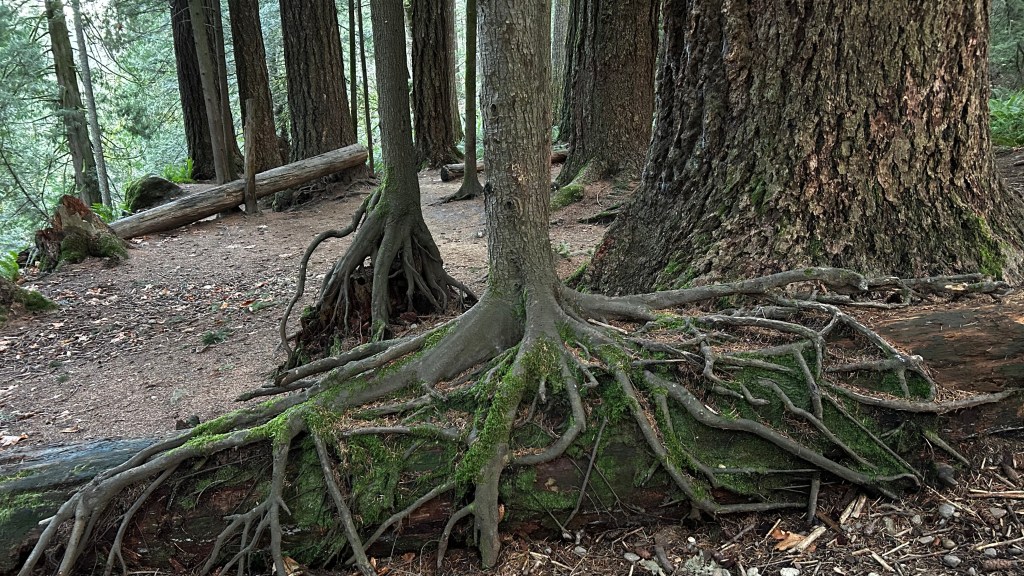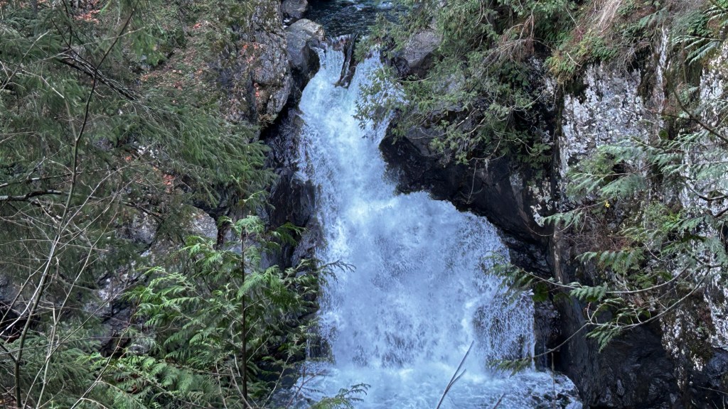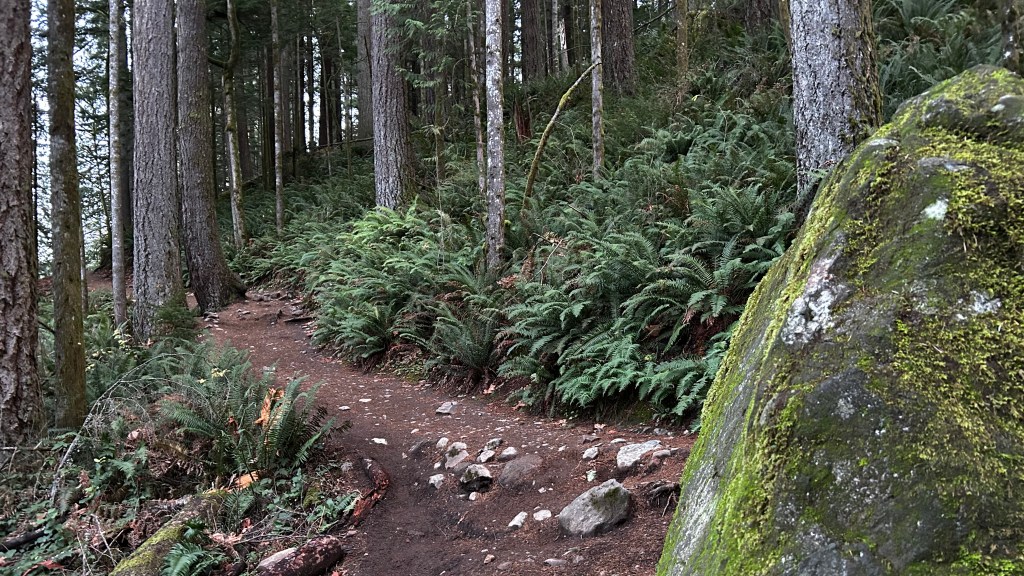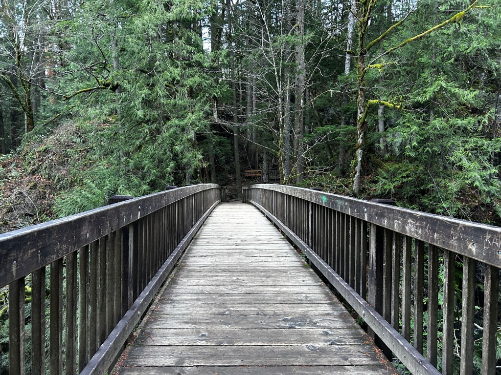 As I ventured along the trail, the sound of the river’s roar filled the air, a symphony of nature harmonizing with my thoughts. The path was well groomed with dirt, roots, and rocks, demanding careful attention to my footing, especially in the slick spots where autumn’s remnants had left a muddy canvas. Here and there, vibrant splashes of fall colors clung to the trees, defiantly resisting the encroaching chill of winter. Each step was a dance of balance and contemplation, surrounded by the iconic elements of the Pacific Northwest—towering trees draped in emerald moss, patches of mushrooms peeking through the damp earth, and the ever-present rush of the river, a reminder of the power of nature’s flow.