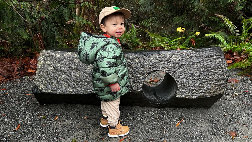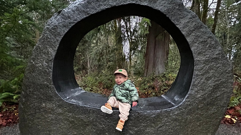 Exploring the many acres of the Bellevue Botanical Garden felt like stepping into discovery, where each garden told its own story. We meandered through the Rock Garden, marveling at its rugged beauty, and strolled through the Waterwise Garden, which captivated us with its clever designs. Ronin’s eyes were wide with wonder as we wandered along the Lost Meadow Trail, where he was particularly drawn to the Night Blooming—a whimsical hive-like sculpture. Our spirits soared as we entered the Yao garden, it was a beautiful scene, even under the thick overcast skies. There was a little extra thrill crossing the 150-foot suspension bridge over The Ravine Experience, and we also enjoyed the art installations, like the Stacked Rocks, which sparked memories of roadtrips to Arizona.