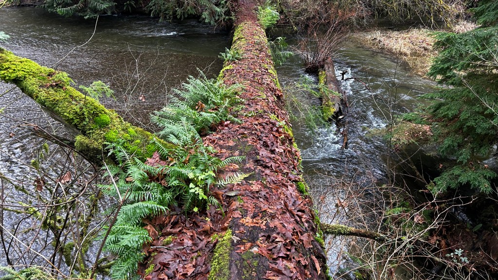 The Chambers Creek Trail unfolded before me, a wide, soft path lined with moss-draped trees and scattered remnants of fall’s splendor. As I walked, the earthy scent of damp soil enveloped me, and the gentle sounds of the rushing creek created a tranquil space. I paused to listen, enchanted by the calls of birds flitting through the trees, their voices echoing in joyful camaraderie. The trail was a refreshing change from the paved path I had just left behind; each step felt cushioned, like walking on thick padding. I ventured slightly off the main path to get closer to the creek, where a massive fallen tree beckoned me to explore. Although crossing it was tempting, I decided against it, mindful of the slippery, decaying leaves on top. With each moment, I felt more connected to this hidden world, a sanctuary where the whispers of the forest felt like an urban secret.