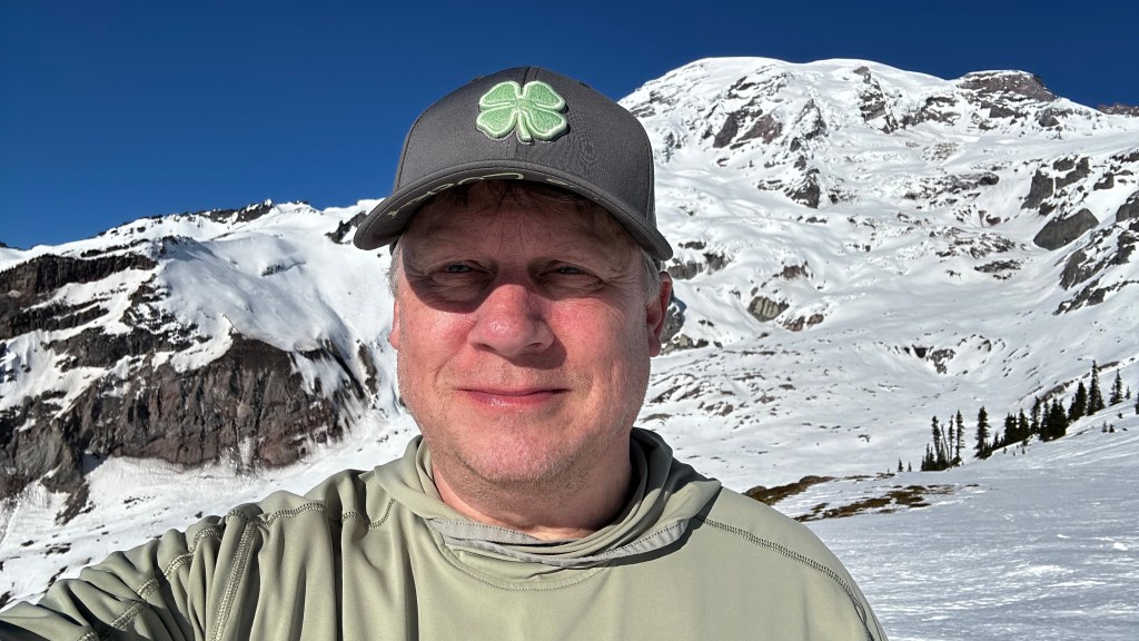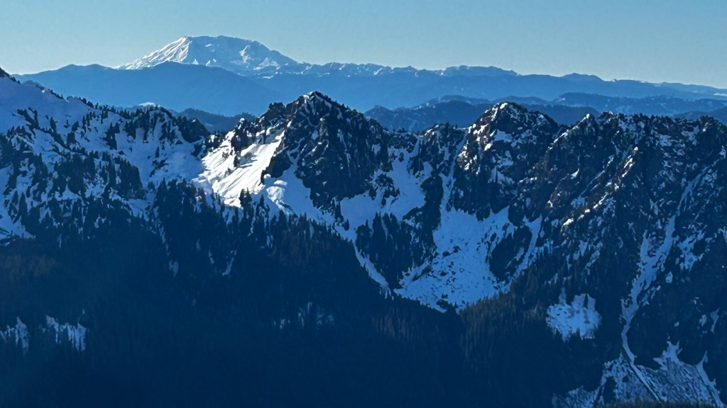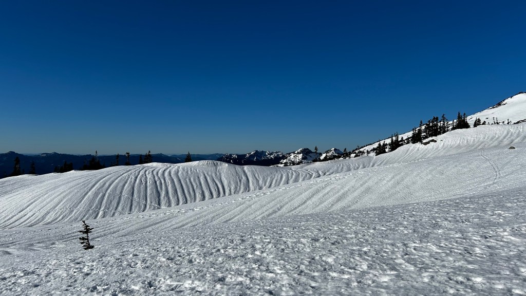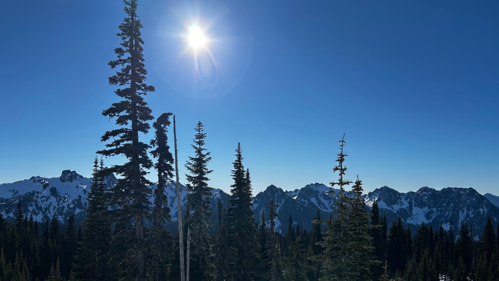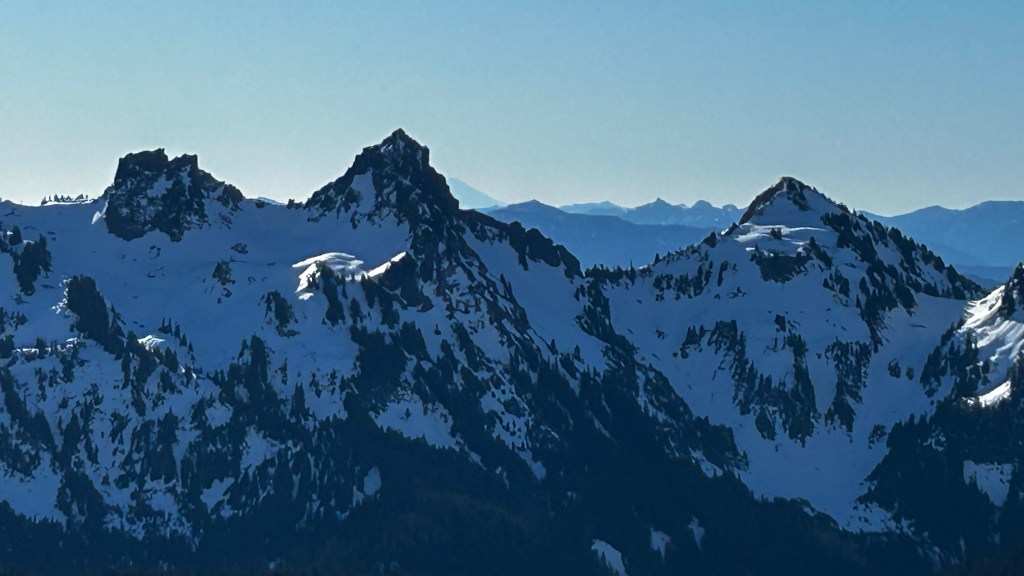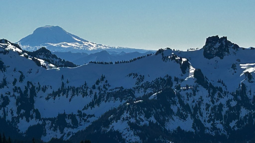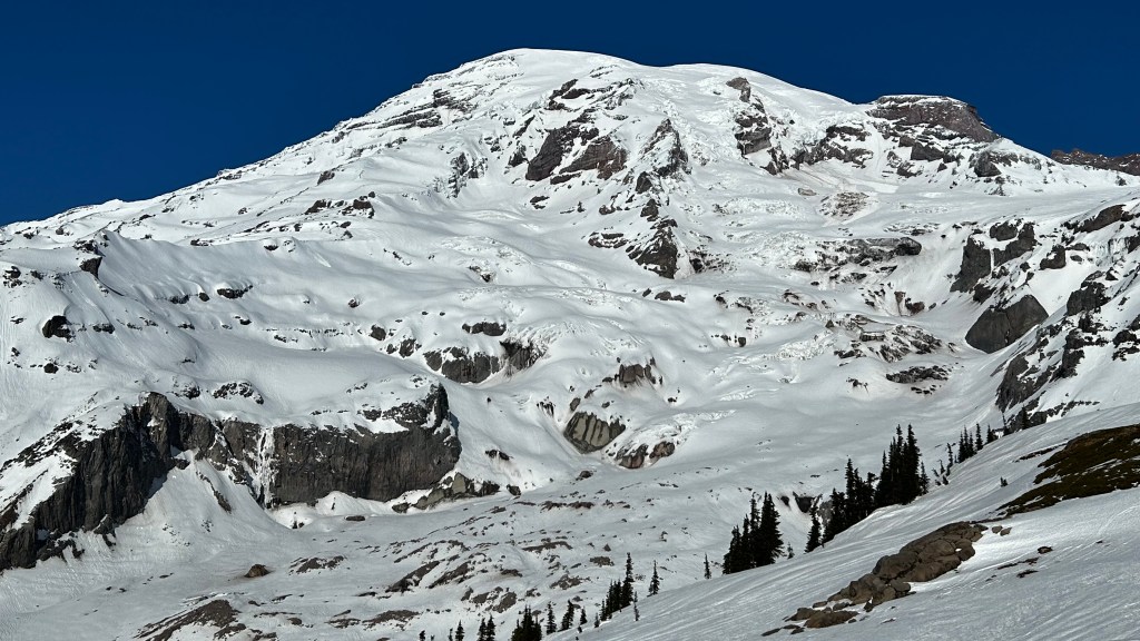 Reaching Glacier Vista was the moment of fulfillment for today. I paused to gaze at the hikers traversing around the summer trail, and some daringly heading straight up to Panorama Point while I chose to linger. The distant sound of sizable tumbling rocks echoed through the vast glacier void, a reminder of the mountain’s raw power. Finding the perfect spot, I slipped off my snowshoes and pack, leaning back against a rock. I closed my eyes, letting the sun’s warmth wash over me. When I finally opened them, the view greeted me and took my breath away—the Cascades stretched majestically before me, a stunning panorama I would never forget. As I descended later in the afternoon, the fulfillment of the day etched memories in my mind, a symphony of sensations that would linger long after I left the mountain.