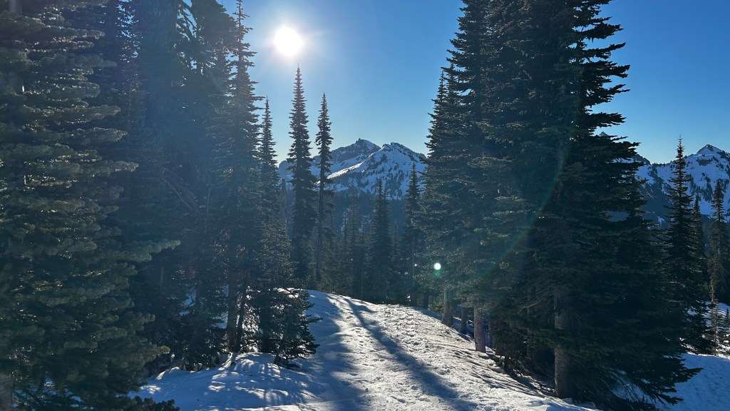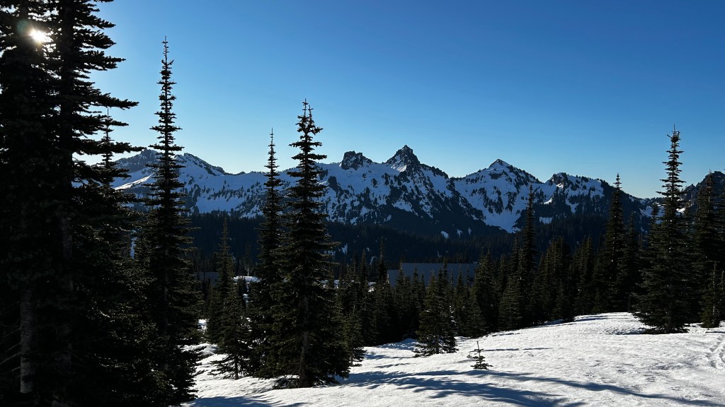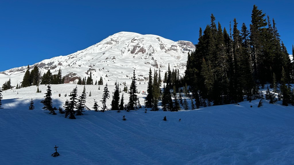After returning from a couple of miles on the Wonderland Trail, the gate finally opened, clearing a path to the Skyline Trail. Strapping on my snowshoes at the trailhead, I felt both excitement and trepidation; this was my first time navigating terrain in snowshoes. Walking in 26-inch shoes felt like a toddlers first steps—clumsy yet exhilarating. My heart raced with the effort, and I found myself pausing often, taking in the dazzling scenery around me. The brilliant blue sky stretched endlessly above, contrasting sharply with the pristine white snow, while the sounds of fellow adventurers gliding past on cross-country skis added a layer of liveliness to the serene scene. Each stop became a mini-celebration where I could soak in the grandeur of Mount Rainier, its majestic presence a constant companion, urging me to keep climbing, one careful step at a time.