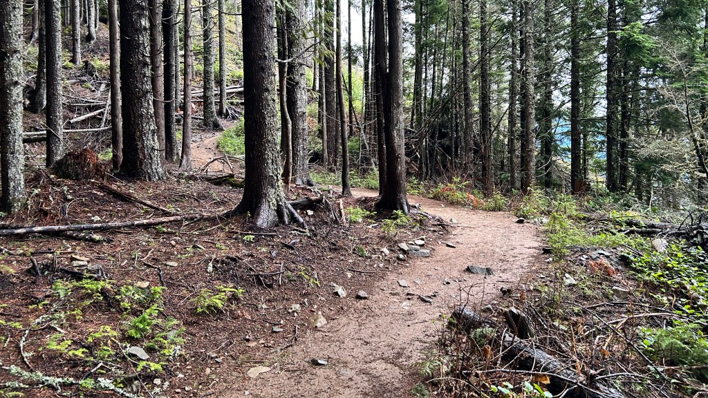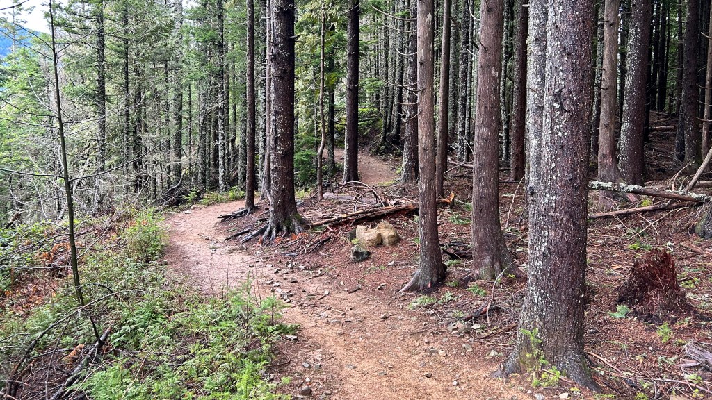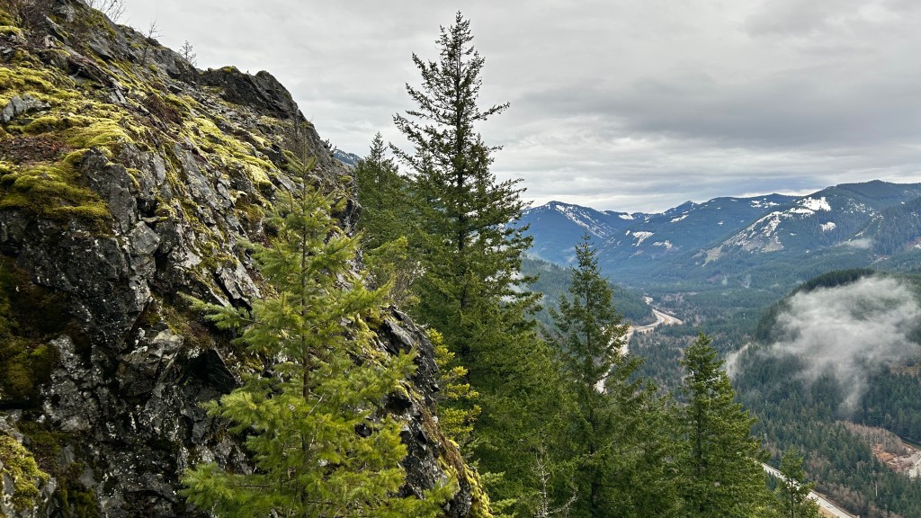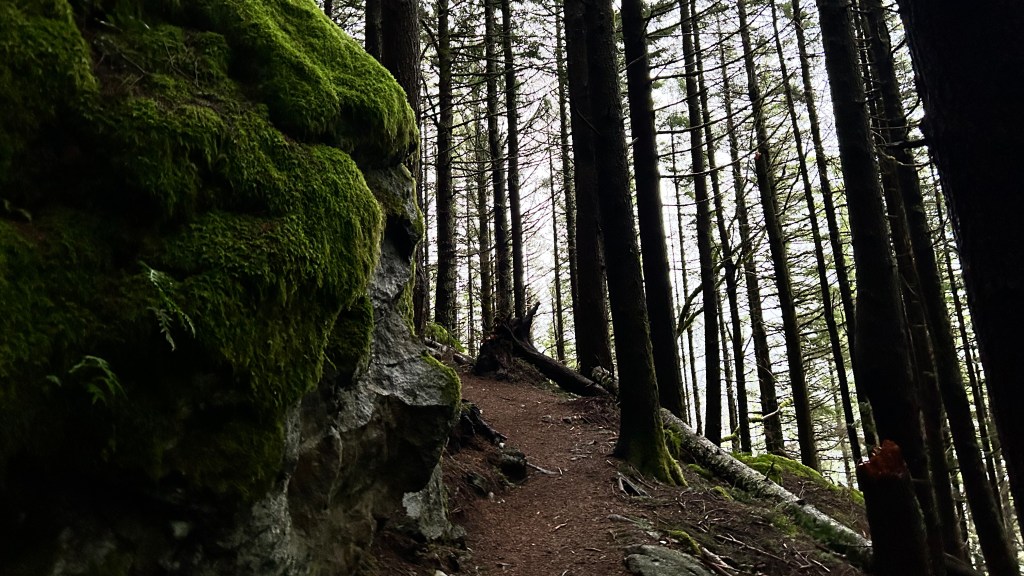 As I stood at the trailhead for Dirty Harry’s Balcony just after 6:30 AM, I was enveloped by a deep darkness, one that limited my physical space. The faint glow of my headlamp cut through the misty drizzle, illuminating the path ahead with a soft light casting shadows in all directions. The air was crisp, holding a refreshing chill at 45 degrees, laced with the rich, earthy aroma of damp moss and wet foliage—a fragrant testament to the rain that had nourished this lush landscape. Yet, the distant hum of I-90’s traffic was a jarring reminder of civilization, an odd comfort in the solitude that I longed to embrace. I took a moment to layer on my rain gear, mentally preparing for the journey ahead, hoping the solitude I craved would soon blank out the noise of the world. With each deliberate step, I felt a rhythm begin to pulse in harmony with the quiet symphony of nature surrounding me.