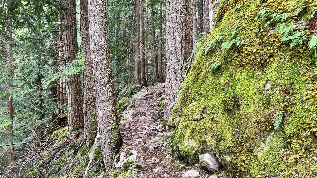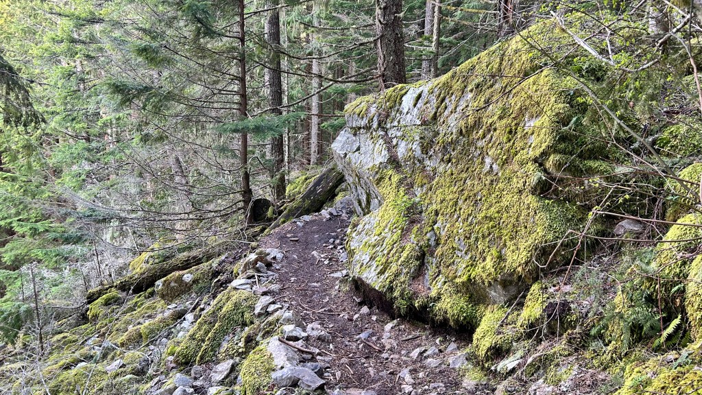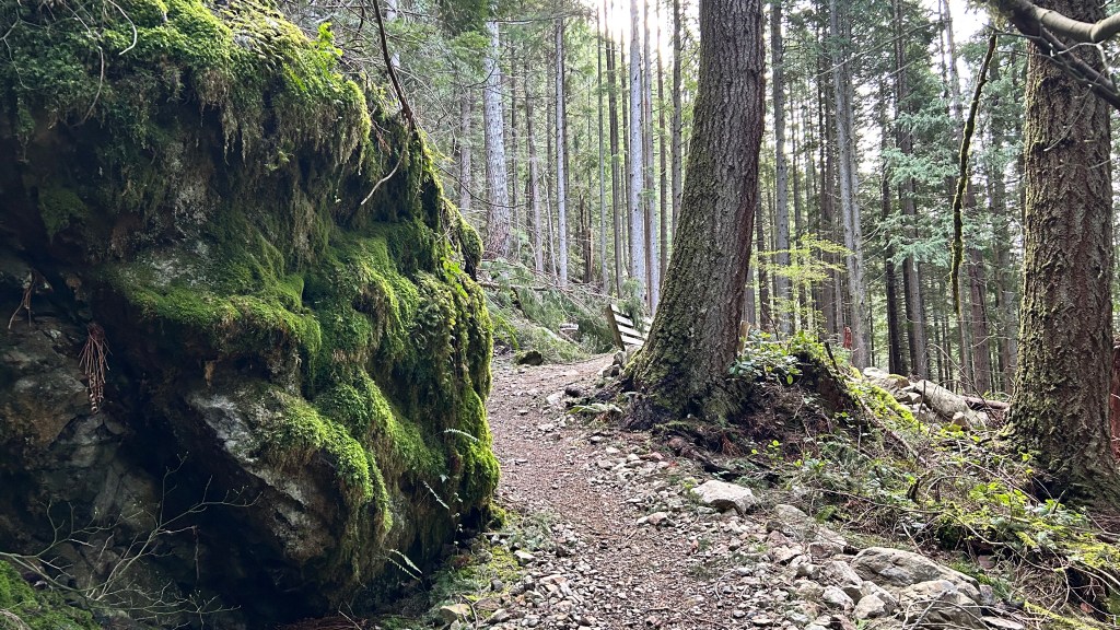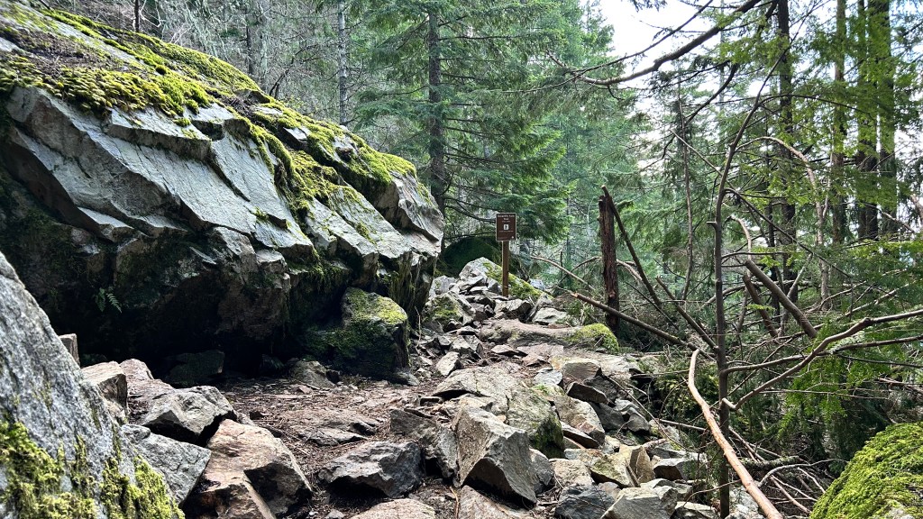 The climb stepped up once I hit the loop. My breath shortened as the elevation gain demanded more, and soon the soft dirt gave way to a more rugged, rocky path. I spent a good portion of the morning playing a live game of frogger, hopping across creeks that seemed to carve their own paths down the mountainside. At one point, I stood on a wooden bridge over a rushing stream, a wall of white noise that felt strangely purifying, even as it overshadowed the melodies offered by the birds. Further up, the scent of freshly cut cedar hit me, likely the work of some trail crew clearing winter debris. It was so sharp and clean it made me think of campfires warming my thoughts of youth, though the patches of snow in the shadows reminded me that winter wasn’t entirely finished with these higher ridges yet.